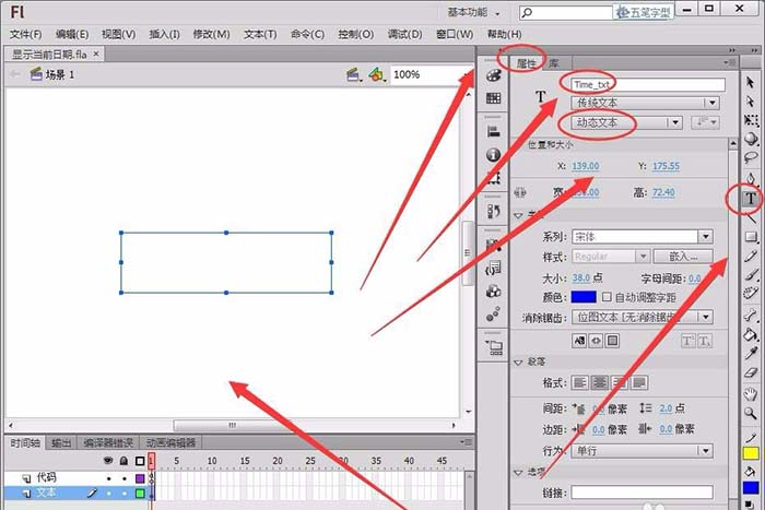 1、在Flash文档中绘制一个动态文本框,属性面板中,将实例名取名为Time_txt。