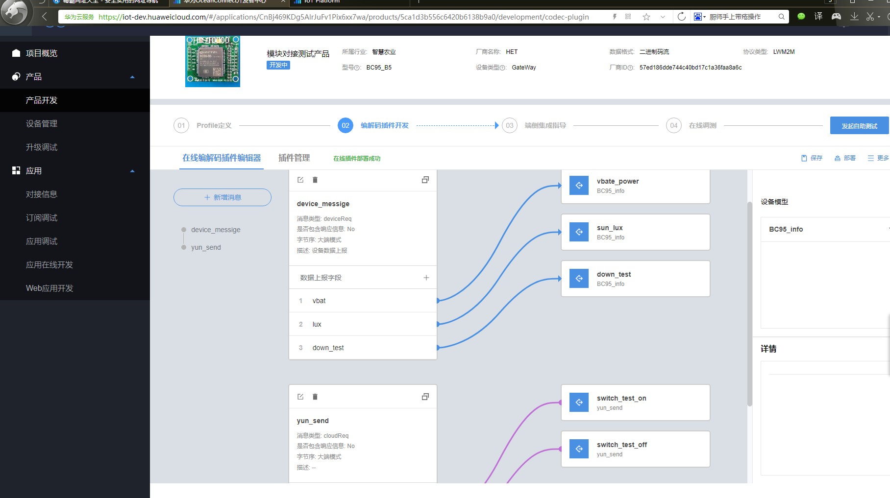 4.接下来添加编解码插件(设备上传的数据是ASCALL格式的16进制数据但最终推送给平台的是joson数据,编解码插件就其转换的作用比如直连服务器直接发joson数据就好)这里穿件好编解码插件后还需要与应用的数据推送数据的配置文件建立联系。