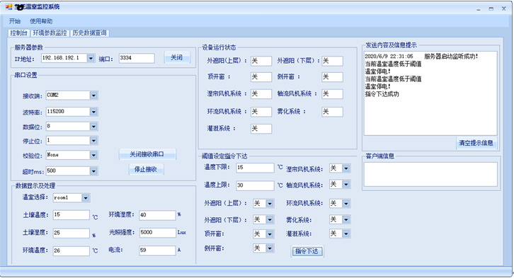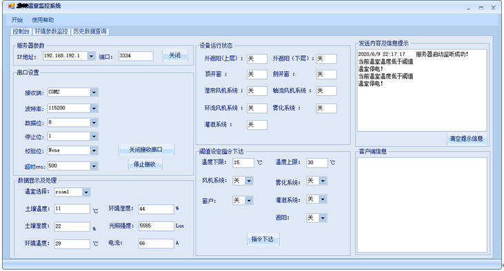 此程序的功能描述:通过上位机可以直接观察到温室的各项实时参数和各个装置的工作状态,并且可以通过曲线图直观地分析该温室最近一段时间的环境变化。上位机可对终端中遮阳、风机等装置进行远程控制。管理员可以通过查询数据库来查看温室的历史环境参数。上位机将采集数据转发至移动终端,方便管理员能够随时随地查看温室内情况,同时,上位机可接受移动终端下达的指令并通过串口转发至底层终端。为了使主进程能够流畅的运行,不出现卡顿的情况,我使用线程池,为每一个模块执行的重要操作都分配一个线程,这样便可以保证程序不再运行过程中会出现无响应等异常情况。整个程序包括自动报警、串口通信、图表显示、数据存储、网络通信等主要模块。