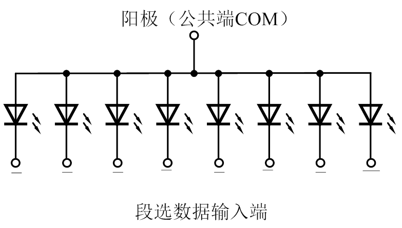 共阳型数码管使用时,其公共极接电源负极或加低电平电平,段选端分别接驱动电路,段选端加低电平时,对应的段发光二极管才亮。