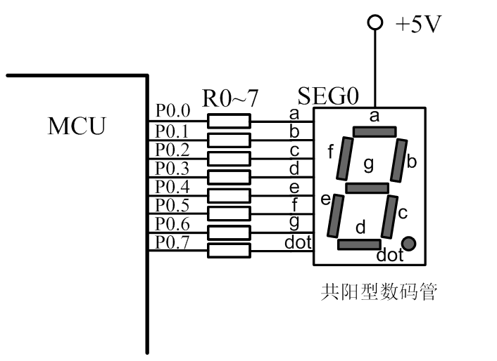 小尺寸数码管的每一段都是由1个LED组成,段驱动电流一般较小,如SM11050K型0.56英寸的数码管寸每段电流在5毫安左右即可点亮,其驱动与LED一样可以直接由单片机的I/O口驱动。利用P0口直接驱动共阳型数码管电路见图3-3-2所示,其中数码管的共阳极(位选端)接电源正极,段选端a~dot依次接P0.0~P0.7,R0~7是限流电阻,一般取几百欧姆。只要段选端出现有低电平,数码管对应的段就会亮,通过组合就可以形成一定的数字。例如,让数码管显示1,即让数码管b、c段亮,程序控制让P0输出0xbe十六进制编码即可,因此共阳数码管显示0~9十进制数字,需要把显示0~9的10个数字编码放在一个数组中,如seven_seg[10] = {0xc0,0xf9,0xa4,0xb0,0x99, 0x92,0x82,0xf8,0x80, 0x90}。