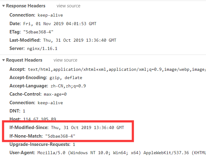 If-Modified-Since ,表示请求时间。web服务器收到请求后发现有头 If-Modified-Since 则与被请求资源的最后修改时间进行比对。若最后修改时间较新,说明资源有被改动过,则响应整片资源内容(写在响应消息包体内),HTTP 200;若最后修改时间较旧,说明资源无新修改,则响应 HTTP 304 (无需包体,节省浏览),告知浏览器继续使用所保存的 cache 。