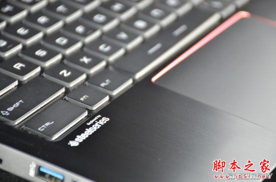 在键盘的左下角是赛睿LOGO,老实说,微星游戏本在15.6寸屏幕下的键盘布局基本都是一样,统一采用了巧克力形式的布局,也统一使用了大键盘、小键盘分开的方式,使得玩家在没有外置键盘时并不会因为使用了游戏本本身的键盘而影响手感。