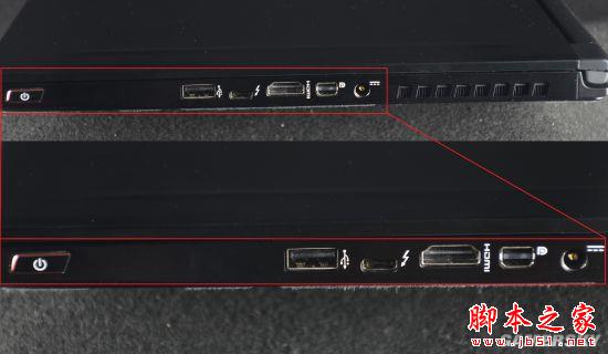 游戏本的左侧和右侧区域划分的非常明显,给人的一种感觉是I/O接口部分被散热给“挤”到一边去了。在游戏本的右侧,从左到右依次是游戏本开关、USB 2.0接口、雷电接口、HDMI接口、MiniDP接口,以及电源接口。