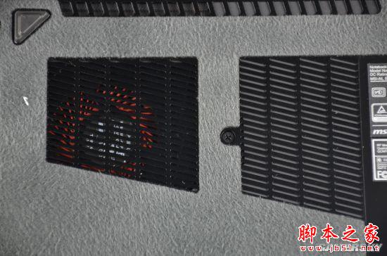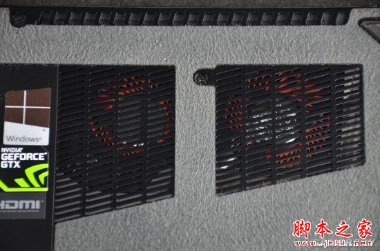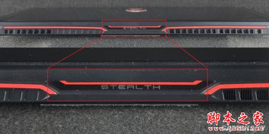 最后,游戏本后面,则是CPU及GPU涡轮散热风扇的出风口,而在中央部分则是STEALTH的英文字样。