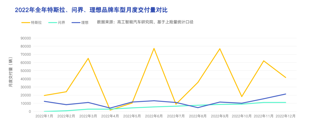 以特斯拉为例,2022年中国市场(不含进出口)交付一直呈现波动性走势。高工智能汽车研究院监测数据显示,特斯拉全年合计交付44.17万辆,同比增长37.26%;而同期新能源汽车交付则是同比增长80.23%,其中纯电动车同比增长67.05%。