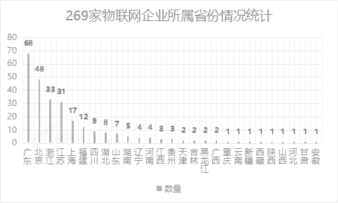 根据统计结果来看,物联网上市企业分布于27个省份。广东省,成为众多物联网企业“安家”的首选。其次为北京、浙江、江苏、上海。