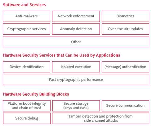 Intel提出的安全纵深防御由三层组成︰硬件安全模块、 硬件安全服务和软件安全服务,如图4.5所示。 硬件安全保护:它的主要职责是安全启动,将环境带到可信赖的初始环境状态,安全存储和一个受信任的执行环境。 硬件安全服务:基于硬件安全建造,并提供快速加密性能、 永恒不变的设备标识、 消息验证和执行隔离。 软件安全服务:在硬件的基础上通过入侵检测和保护服务(IDPS)、防火墙、黑名单/白名单。恶意软件检测、加密服务、生物特征识别,over-the-air更新和其他功能加强安全性。 下面会简要介绍各个层次的主要技术。![]()