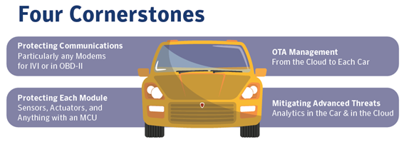 赛门铁克[②]在工控系统安全方面主要有两类解决方案,一是针对操作者如何保护工厂和基础设施的安全,二是针对设备供应商如何在其产品中增加安全性。 赛门铁克利用分析技术和机器学习对ICS网络建模以使用户理解自己的网络,从而检测高级威胁。 Symantec Embedded Security: Critical System Protection(SES CSP)是一个轻量级的安全客户端,通过保护终端和嵌入式设备来保护物联网安全。它在不影响设备性能的情况下向制造商和资产所有者提供embedded systems robust signatureless, host-based protection in managed and unmanaged scenarios。由于是基于策略的防护,SES CSP不需要像杀毒软件那样进行安全内容更新。 赛门铁克对汽车安全领域的分析沿用了上文提出的安全框架,同样分为四部分: