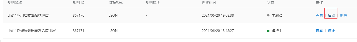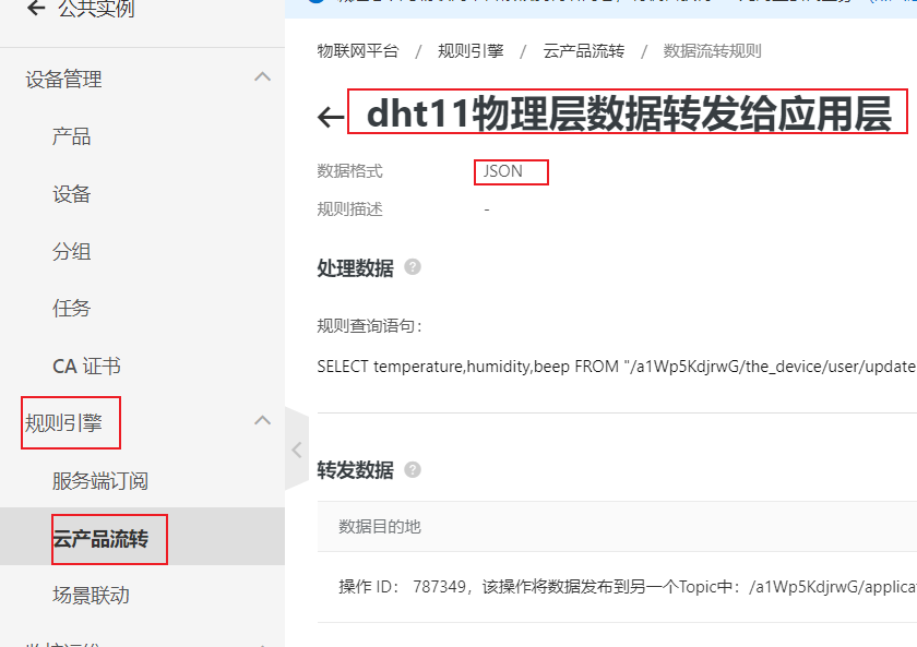 物理层的数据上传至平台后通过规则引擎可以将物理设备的数据转发给应用层使用,在阿里物联网平台的规则引擎中选择云产品流转,点击创建规则,创建完成如图5.4所示。