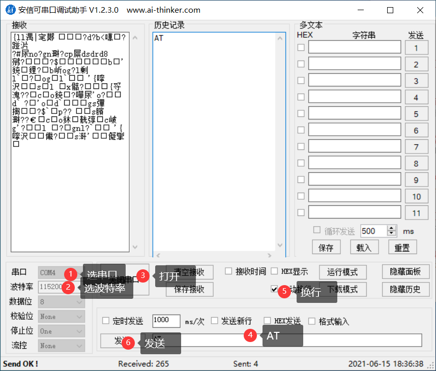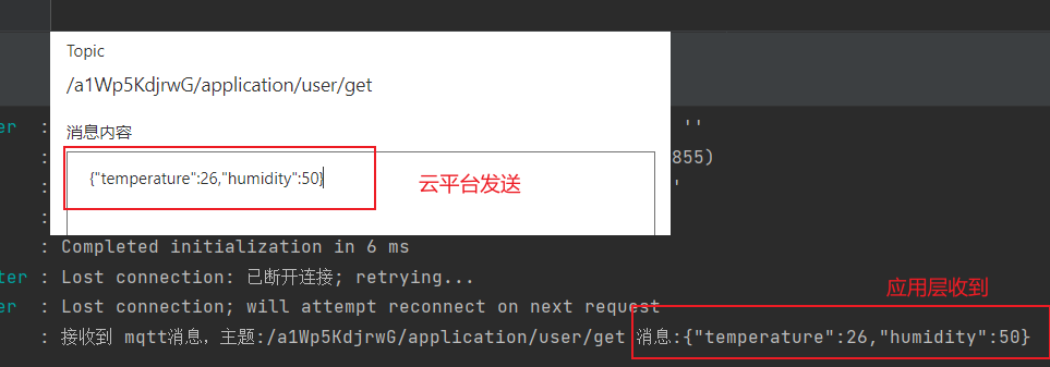 启动SpringBoot项目,打开开发板,测试是否连通,连通效果成功,控制台收到物理层数据如图5.10,使用web发送数据串口打印如图5.11所示。