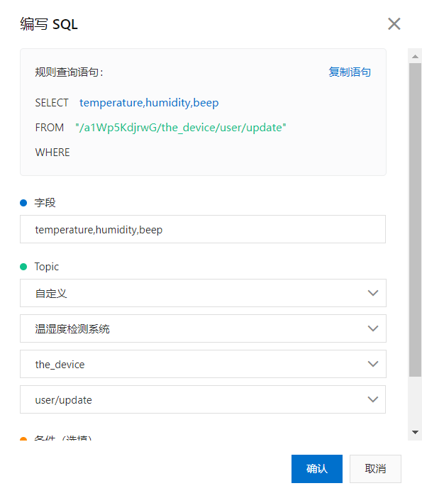 点击编写SQL语句,通过SQL语句获取到temperature,humidity,beep这几个数据,如图5.5所示。