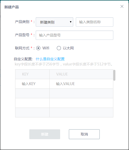 - 设置产品类别、产品型号、联网方式,可根据自身需要设置自定义配置信息,信息填写完成后,点击【新建】按钮;