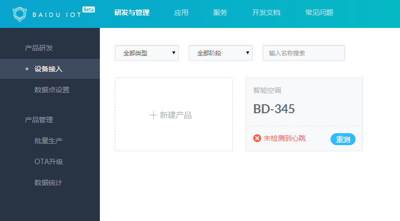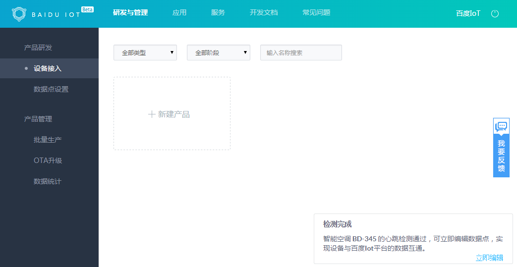 - 在开发者完成了注册流程后,进入开发者中心,打开新产品研发界面,点击【新建产品】按钮,开始创建产品;