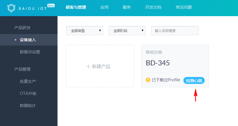 设备联网后,在云端点击【检测心跳】操作,自动检测设备是否已向云端上报心跳,如检测成功表明已与云端连接成功;