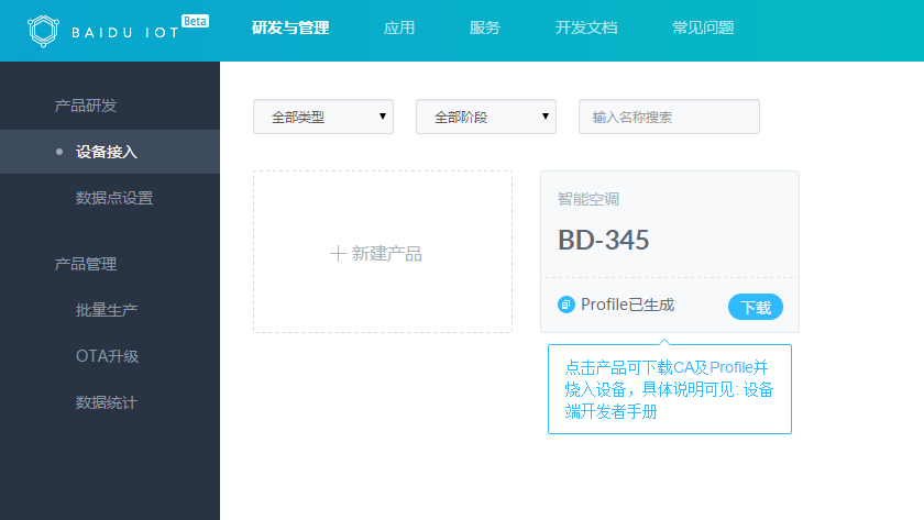 产品创建完成后,您可以在新产品研发的右边区域看到您刚才创建的产品。同时,Profile文件已经生成,请直接下载Profile,Profile文件包含了设备连接到云时所需的一些信息,比如设备id、接入token等。