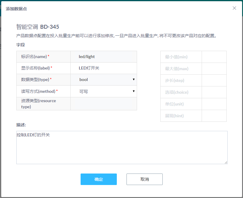数据点是云端与设备端约定的监控命令和数据上报集合。数据点分为两类,其中控制数据点(Resources类型)描述设备端接受的监控命令集合,云端通过请求设备端获取或修改控制数据点来监控设备。另一类上报数据点(Report类型)描述设备端可能向云端上报的数据。