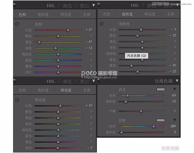 橙色,黄色,红色控制肤色,适当减少红色黄饱和度,增加明亮度,紫色控制暗部颜色,降低紫色和洋红色饱和度。