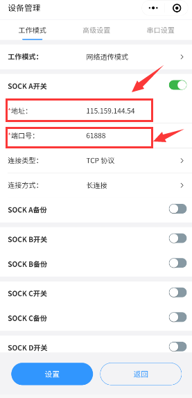 说明 地址为服务器地址,端口号为服务器端口号,若无自己的物联网服务器,可选择地址:prod.iotn2n.com,端口号设为20456