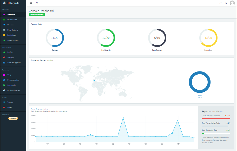 Thinger.io是IoT的开源平台,可为连接设备或物品提供可扩展的云基础架构。 您可以使用管理控制台轻松控制它们,或使用其REST API将它们集成到项目逻辑中。 IT支持所有类型的黑客板,如Arduino,ESP8266,Raspberry Pi,Intel Edison。
