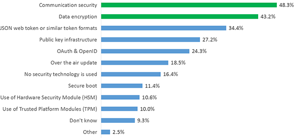 今年主要用于物联网安全解决方案的技术是占比 48.3% 的通信安全(TLS、DTLS)和 43.2% 的数据加密。此外,面向硬件的安全解决方案似乎不太受欢迎,如使用可信平台模块(10%)、硬件安全模块(10.6%)。