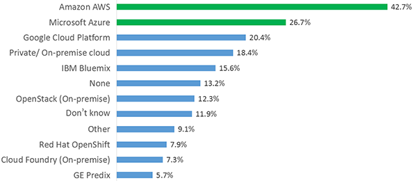 亚马逊(42.7%)继续成为领先的 IoT 云平台,其次是 Microsoft Azure(26.7%)和 Google 云平台(20.4%)。今年一个重大变化是私人/内部部署云的使用量下降,从 2016 年的 34.9% 下降到 2017 年的 18.4%。这意味着 IoT 云平台现在已经更加成熟。