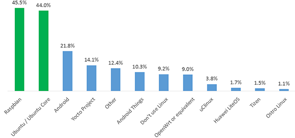 Linux 发行版中 Raspbian(45.5%)和 Ubuntu(44.%)使用率位居一二。