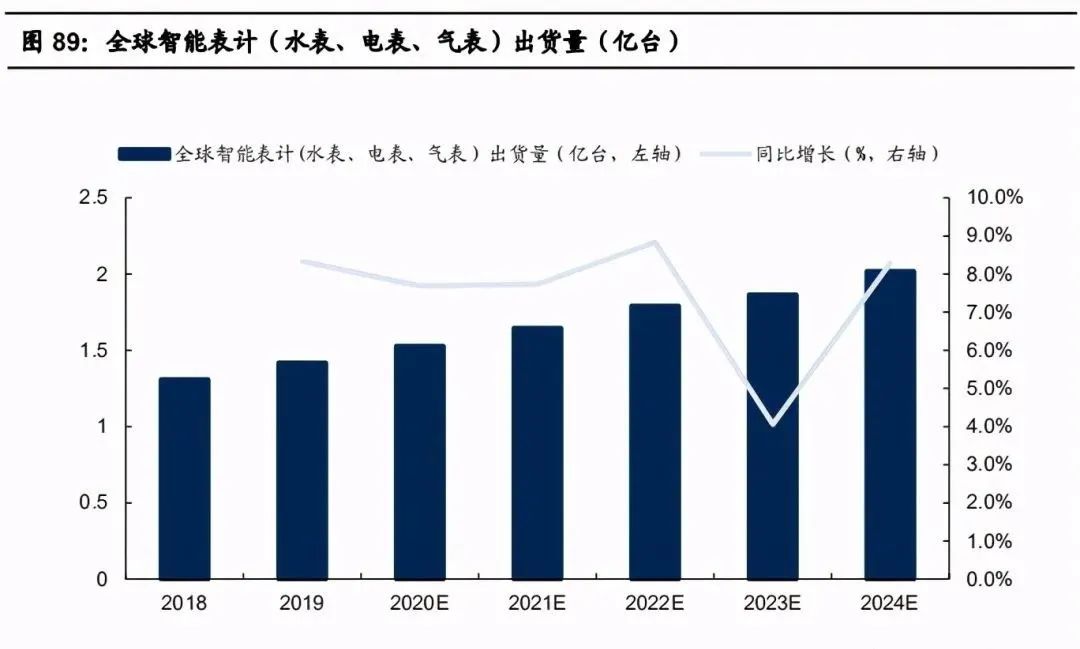 水表方面,2019年起,家用智能水表开始规模升级,目前渗透率约为30%,未来向上的空间和增速较高。电表方面,国家电网目前包括控制器、 传感器、智能电表、监测仪等在内的各类连接设备终端已经超过5亿台,公司计划2025年超10亿台,2030年超20亿台。总体来说,包括水、电、气表在内,根据 IoT Analytics 预测数据,2018 年全球智能表计出货量为1.32亿台,2018至2024年CAGR达7%,预计 2024年达到2.03亿台。