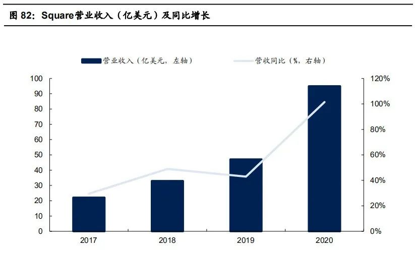 2019年,中国商业物联网整体市场规模为1161亿元,占全球比例为17.7%,预计2020年因受到疫情影响,商户收入将出现明显下降,进而导致其 在硬软件支出上的回落。在疫情好转后商业物联网将恢复增长,到2023年中国整体市场规模将达到1438亿元。 Square(SQ.N)围绕交易环节探索研发硬件、软件产品,以满足商户在企业经营上的需求:公司主要业务包括交易费(支付抽佣)、软件订阅及 服务收费、硬件销售及比特币收入。2020年公司实现营收94.98亿美元,同比+101.5%;其中商户服务环节(包括交易费、软件订阅及服务收费 及硬件销售收入)合计49.26亿美元,同比+17.4%,实现疫情下的逆势增长。