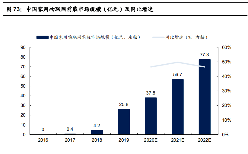 采用前装形式部署能够赋予家用物联网系统高度的一致化体验,但相较于后装形式,采用前装的方式进行家用物联网部署投入更高、周期更长, 前装销售收入的确认存在一定的滞后性,发展整体晚于后装市场。因此,目前国内前装市场主要针对中高端客户,以精装楼盘为例,国内精装楼 盘智能家居的配置率逐步提高,部分产品(智能安防、智能门锁)已突破60%。整体市场来看,2019年国内前装市场规模达到25.8亿元,未来将 保持30-50%的增速,预计2022年市场规模可突破77亿元。