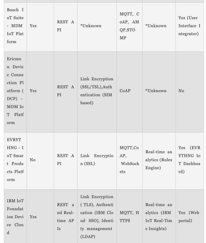 这些平台还有其他一些共同点:基于REST API的集成、支持MQTT协议作为数据收集手段以及使用SSL进行链接加密。表中没有提及只有ParStream有每秒三到四百万的通量。这表明,大多数物联网软件平台的设计都没有考虑到物联网部署在实际操作中的系统性能方面。