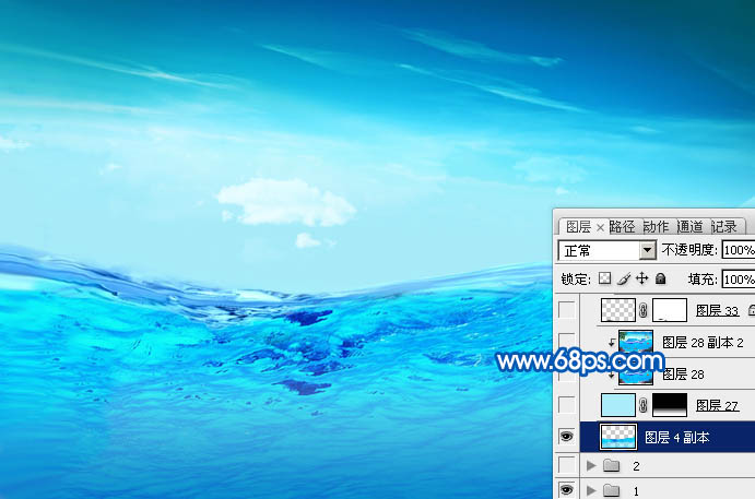 7、打开海水素材,拖进来放到水珠图层的下面,添加图层蒙版,用黑色画笔擦掉不需要的部分,只保留水珠下面的局部,如下图。