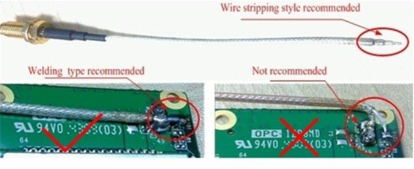 如果连接外置天线的射频连接器是通过焊接方式与模块相连的,请务必注意连接线的剥线方式及焊接方法,尤其是地要焊接充分,请按照下图中正确的焊接方式进行操作,以避免因焊接不良引起线损增大。