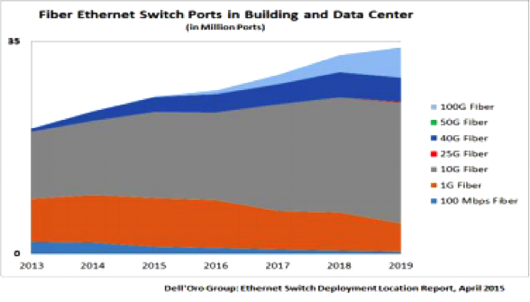 下图1以太网端口趋势的预测来自DELL,可以看到2016年100G的应用处于急速增长前的阶段。