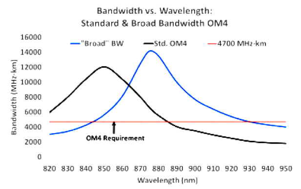 传统OM3及OM4的多模光纤的主要传输窗口定义在850nm, 而如果采用SWDM技术则需要有四个窗口传输光信号,四个波段光源仍采用性价比高的VCSEL垂直腔面发射激光器。为了提高整体的带宽,新一代多模光纤WBMMF(Wideband Multimode Fiber)的带宽将有了新的提升,带宽性能最高点处于大约在880nm波段附近且最高带宽点高于传统OM4多模光纤,参考下图5关于传统多模OM4光纤与WBMMF光纤的带宽对比图。