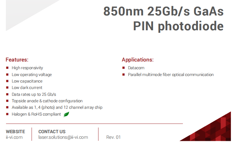 上节分析了25G VCSEL芯片,这节谈谈II VI 25G PIN.