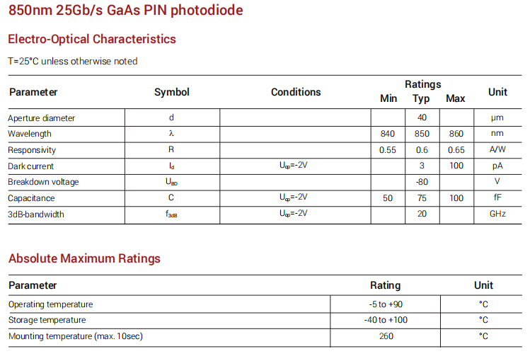 850nm波长砷化镓 25G PIN芯片,光电二极管常见的参数有响应度,暗电流,响应波长,光敏面直径等,如下图: