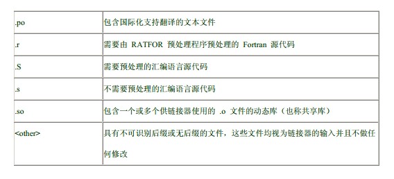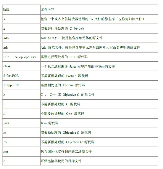 编译程序通过匹配表中的后缀检查文件名,从而判断文件的内容。选项-x 可以指示编译程序忽略后缀并将文件作为某一类型对待。