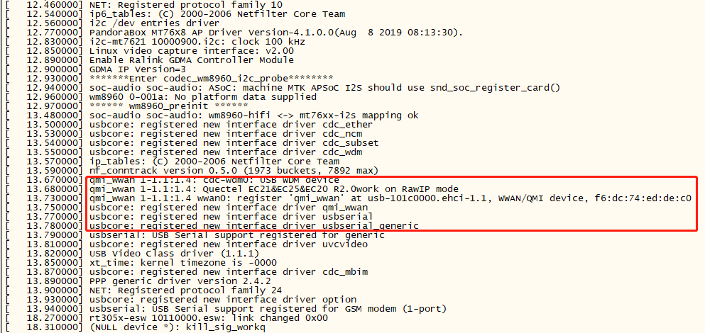 [ 209.750000] qmi_wwan 1-1.1:1.4: Quectel EC21&EC25&EC20 R2.0work on RawIP mode