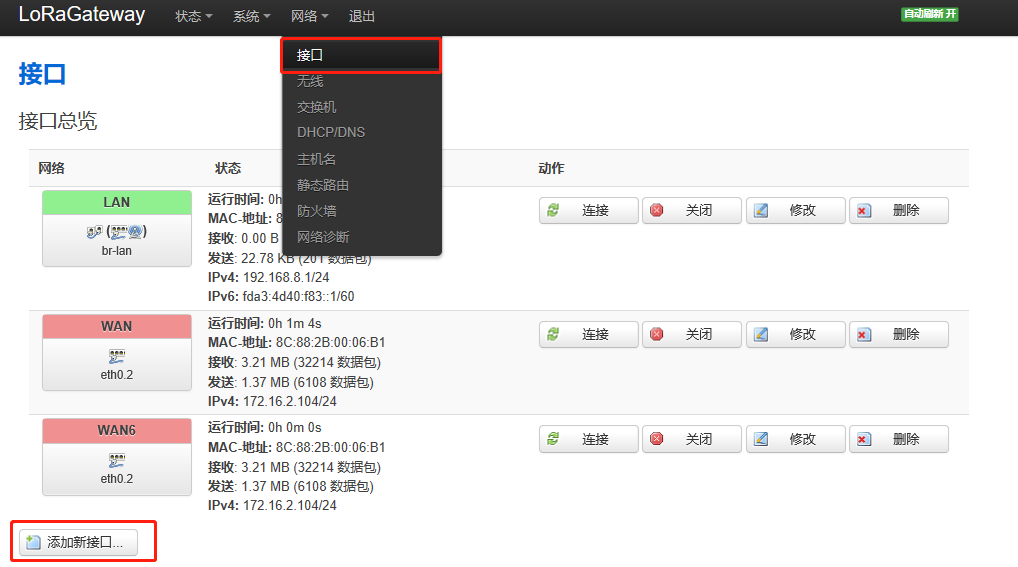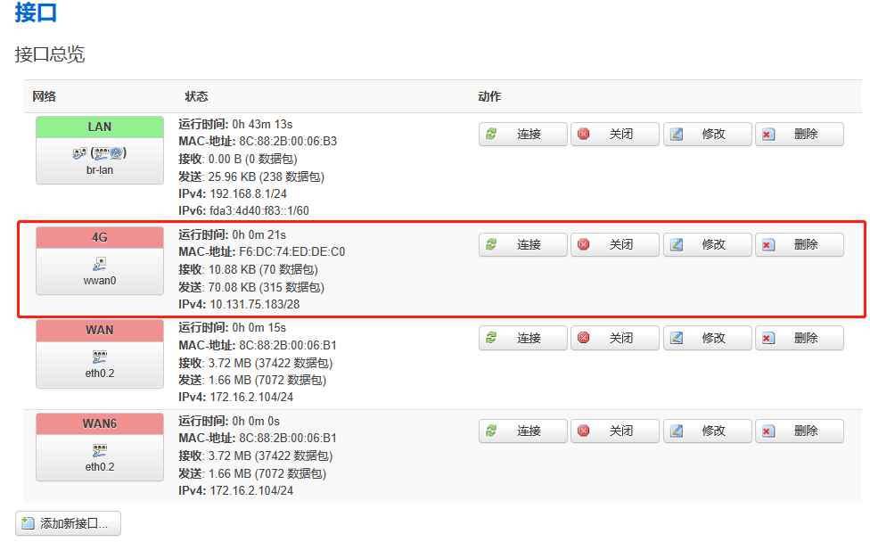1、登陆 openwrt 配置页面,打开“网络” -> “接口” -> “添加新接口”。