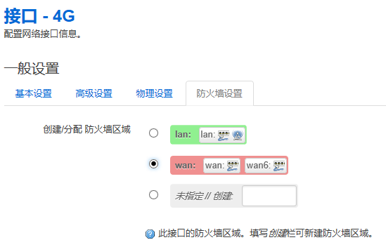 3、"防火墙设置 "配置成”wan“模式
