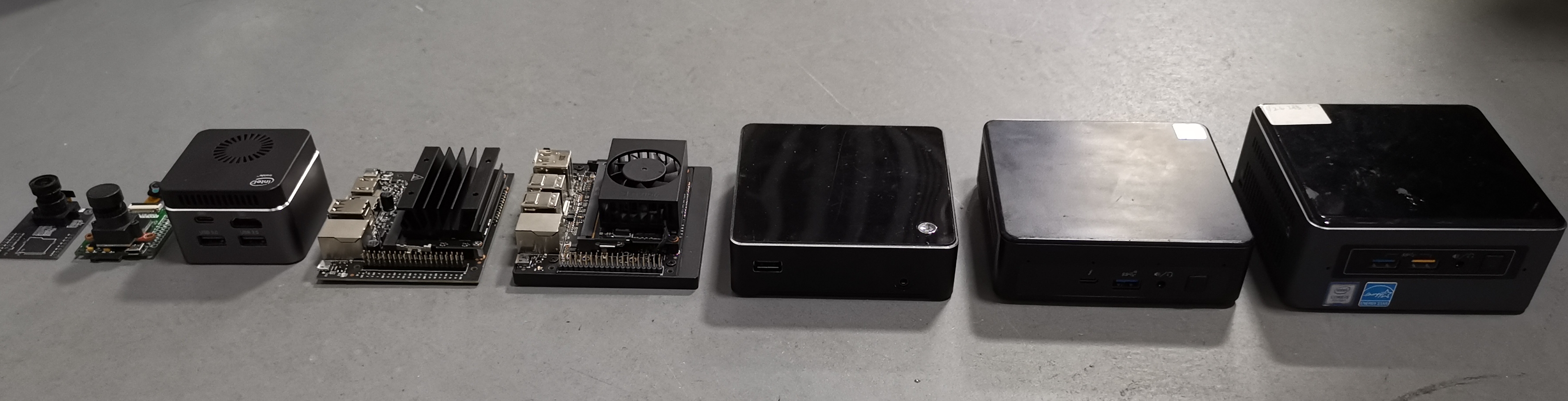 各个运算平台大小的对比,从左起依次是k210、openmv、某N4100的minipc、Jetson nano、jetson Xavier NX、i7-8265u的minipc、intel NUC11猎豹峡谷、intel NUC7 Bean canyon