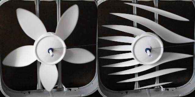这两幅风扇的图像是在相同时刻分别用全局快门和卷帘快门的相机拍摄的