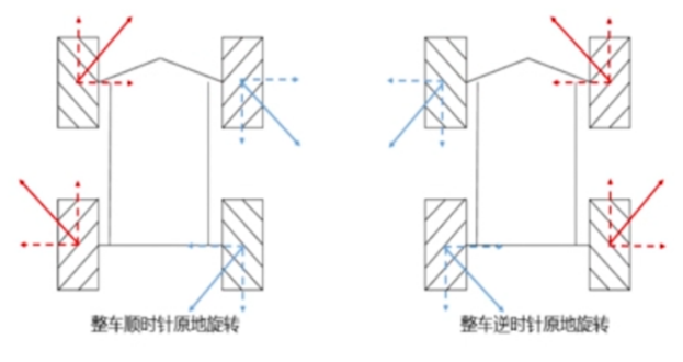 - 逆时针旋转时,左前和左后向后转动,右前和右后向前转动