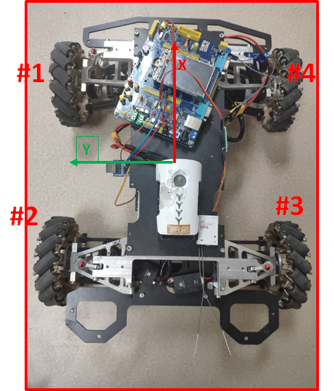 小车硬件实物如下图所示,定义左上角电机的编号为#1,左下为#2,右下为#3,右上为#4。正前方为X方向,水平方向为Y方向(与ROS中的坐标系相同)。