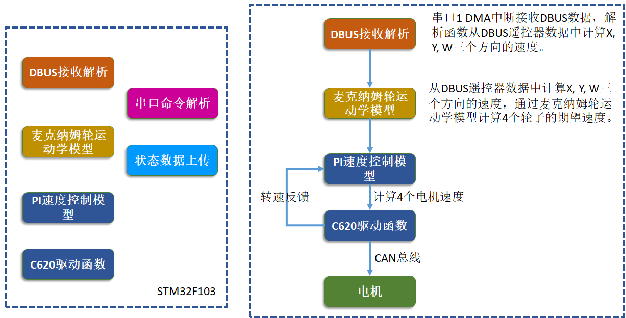 具体而言首先使用串口1接收来至接收机的数据,然后由麦克纳姆轮运动学模型将X、Y、W三个方向上的速度转换为四个电机的目标转速(RPM)发送给PI控制作为目标速度,随后PI控制器接收四个轮子的目标转速实现速度闭环控制,并计算控制量,通过CAN总线传送到电机。最后由状态数据上传模块定时上传底盘上电机、IMU、超声波的数据到上位机上。