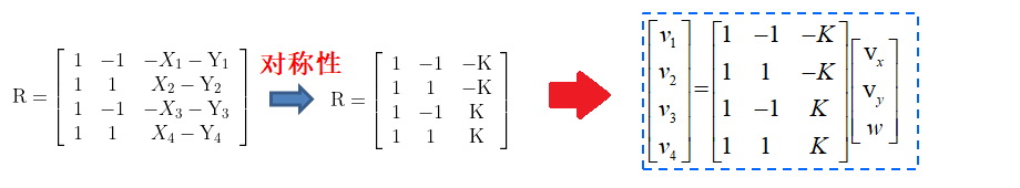 通常我们设计的底盘是轴向对称的,也就是坐标系时原点到四个轮子的距离相等。所以每个轮横、纵坐标的绝对值各自相等,令K=abs(Xn)+abs(Yn),根据每个轮坐标所在象限的符号,矩阵可化简为: