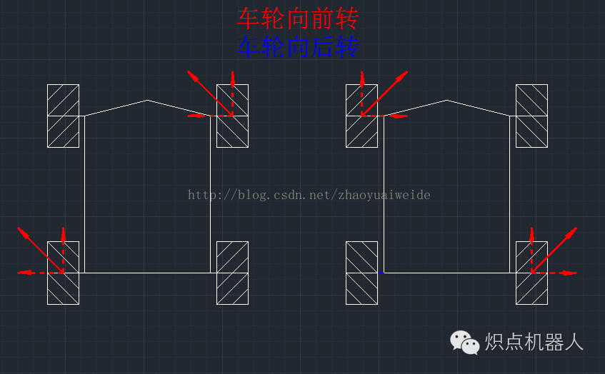 只要同向转动对角线上两个轮子,