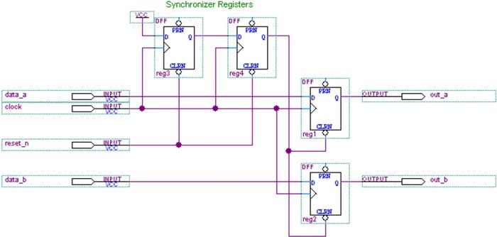 同样,为了减少亚稳态对上述同步器中的两个寄存器的影响,同时也是为了增加平均无故障时间(MTBF),这两个寄存器应该在FPGA中被放置的越靠近越好,以尽量减少在器件中的布线延迟。Quartus II的fitter将会自动认识到这些寄存器是用于同步器,所以会自动地进行上述处理,作为本例这两个寄存器将会被布局到同一个LAB中。