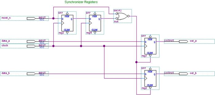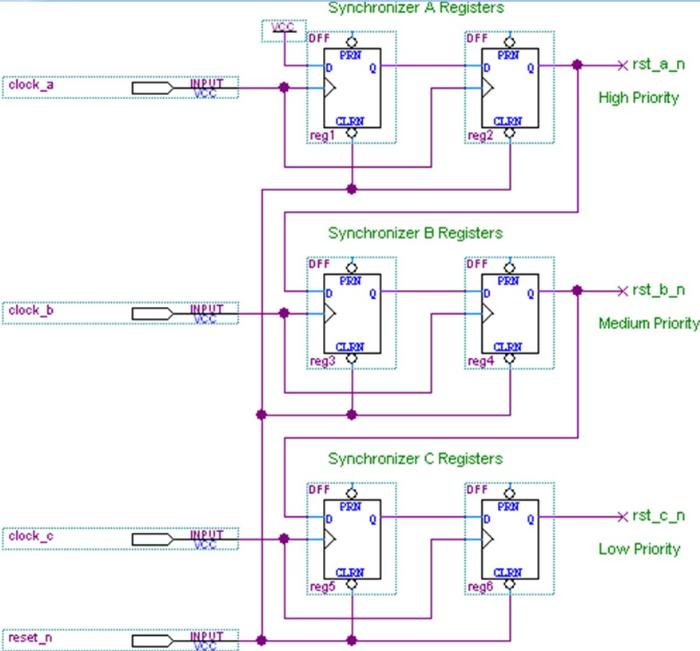 在将异步复位连接到寄存器的异步输入端口前给它加入一个同步器,这样就创造一个叫同步化了的异步复位。这种复位具有异步复位那样的立即将复位作用于电路好处,同时又提高电路速度,因为它们不会给数据路径带来额外的延迟。同时,这种复位象同步复位那样避免了亚稳态问题,而且保证所有的寄存器能够同时从复位状态跳出。不象异步复位,同步化了异步复位可以在TimeQuest里分析Recovery和Removal。正是由于这些原因,同步化了的异步复位是大部分FPGA设计中复位电路首先方法。